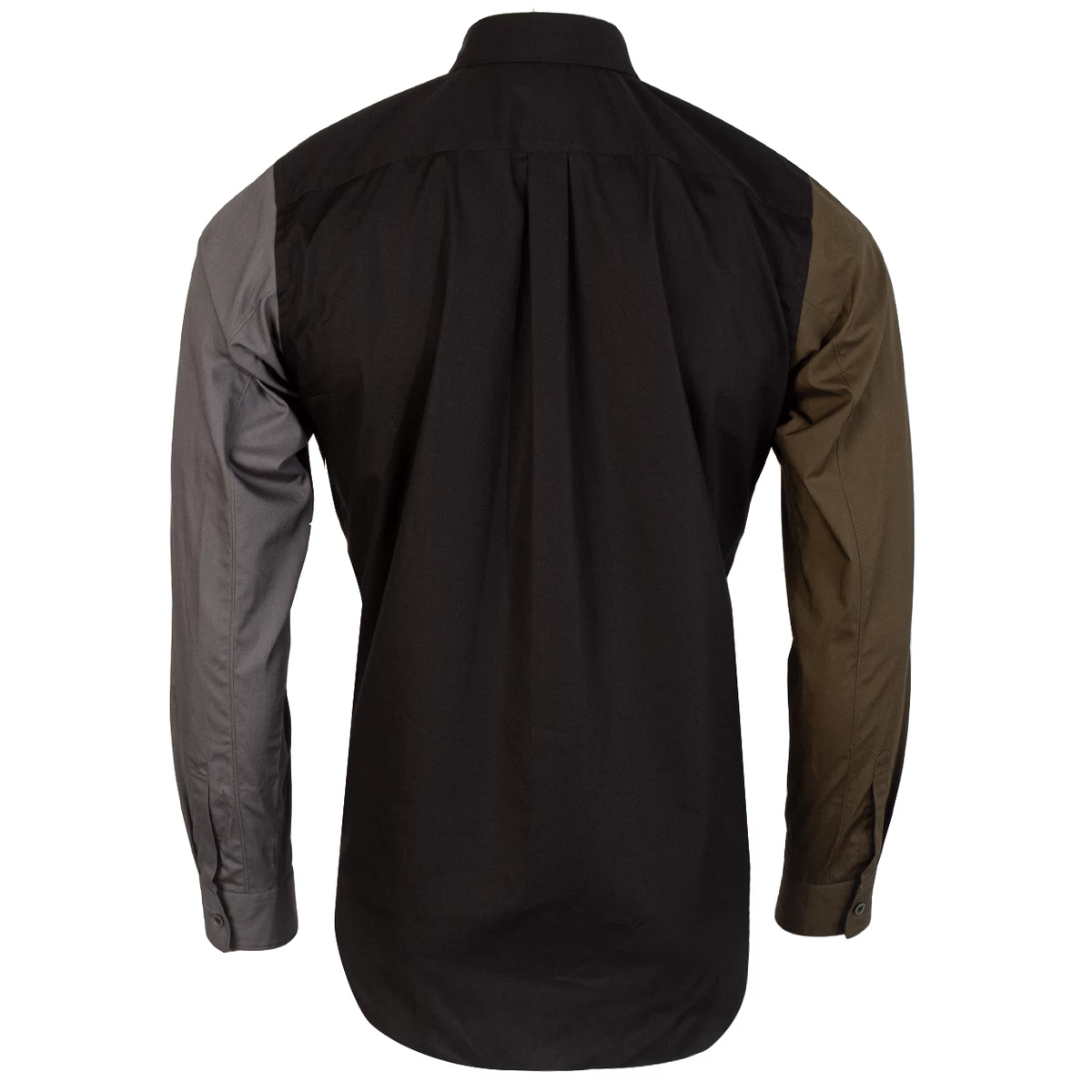 This shirt offers a sophisticated look and features a point collar, button fastening, chest pocket, and contrast grey and khaki sleeves.