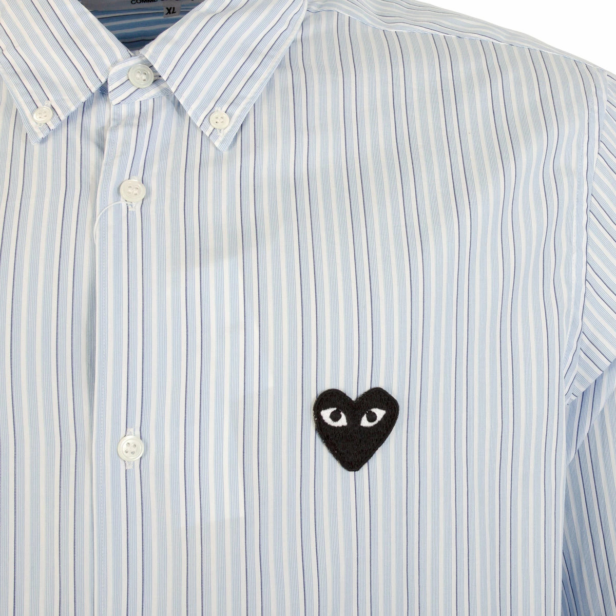 Men’s Black Heart Striped Shirt in Blue / White / Navy from the Comme des Garcons PLAY Classic Collection. Like this? Shop the complete Comme des Garcons Collection at Hervia.com.