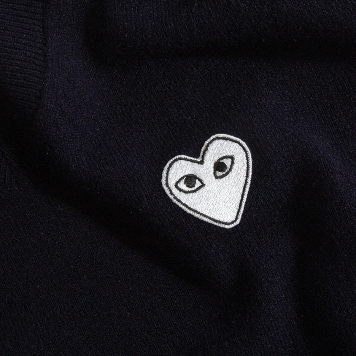 Men’s White Heart V-Neck Jumper in Navy from the new Comme des Garçons PLAY Collection. Comme des Garçons, or ‘like the boys’ in French, has pushed the blurred aesthetic of masculine and feminine motifs with playful overtones since it’s creation in 1969 by legendary designer Rei Kawakubo.