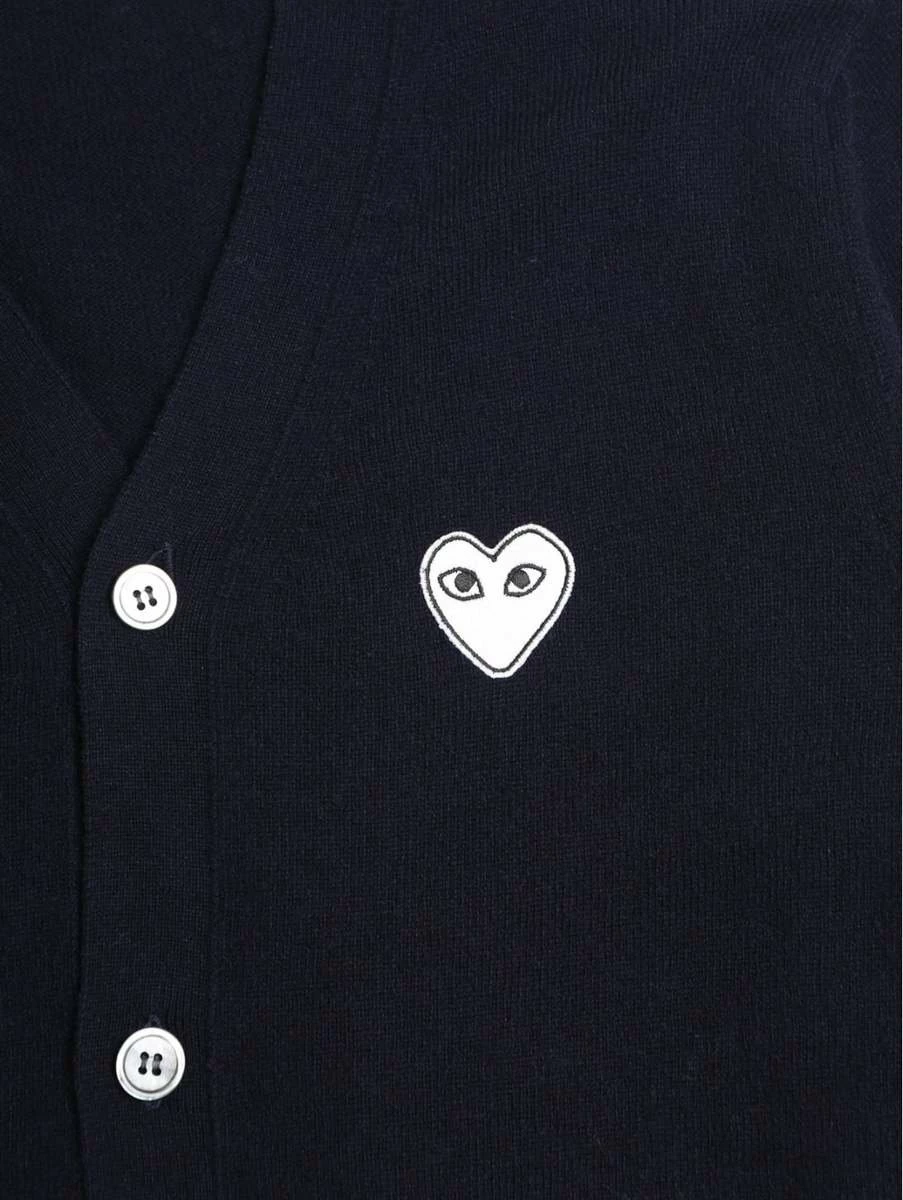 White Heart Logo Cardigan in Navy from the new Comme des Garcons PLAY Collection. Comme des Garçons, or ‘like the boys’ in French, has pushed the blurred aesthetic of masculine and feminine motifs with playful overtones since it’s creation in 1969 by legendary designer Rei Kawakubo.