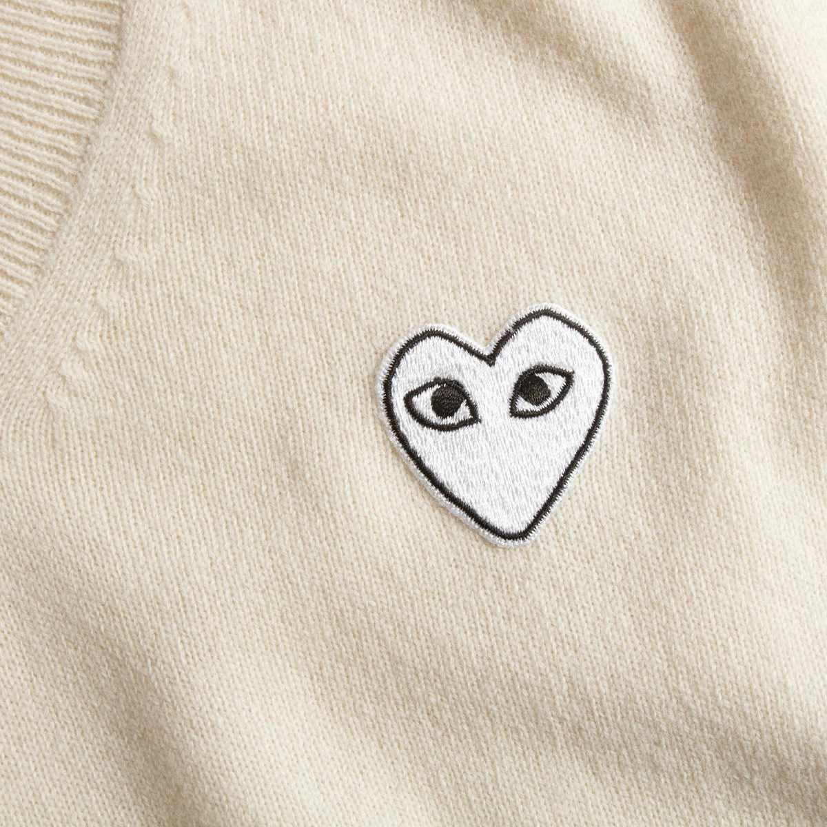 Men’s White Heart V-Neck Jumper in Off White from the new Comme des Garçons PLAY Collection. Comme des Garçons, or ‘like the boys’ in French, has pushed the blurred aesthetic of masculine and feminine motifs with playful overtones since it’s creation in 1969 by legendary designer Rei Kawakubo.