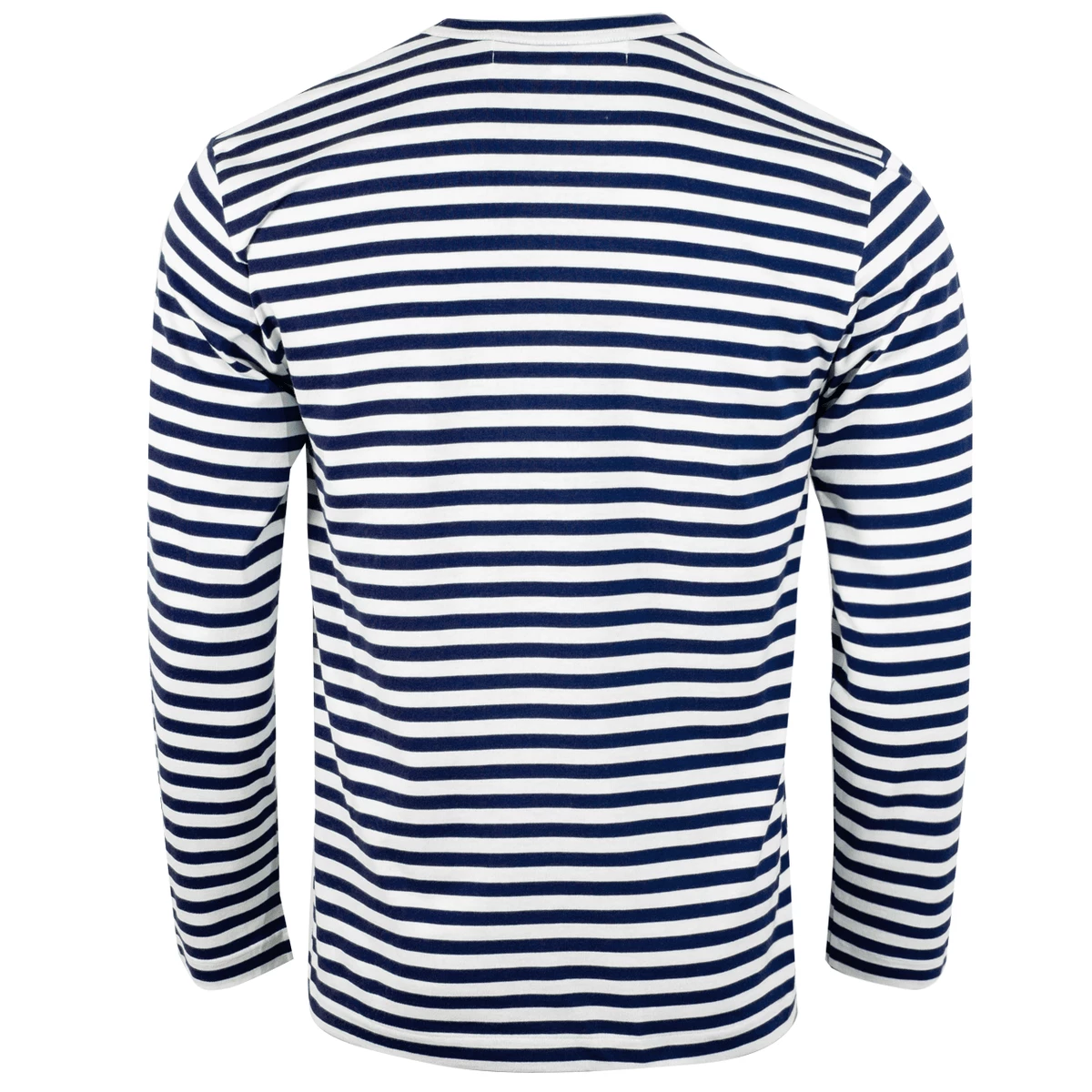 Men’s PLAY Men’s Black Heart Stripe L/S T-Shirt In Navy/White from the Comme des Garçons PLAY Classic Collection.