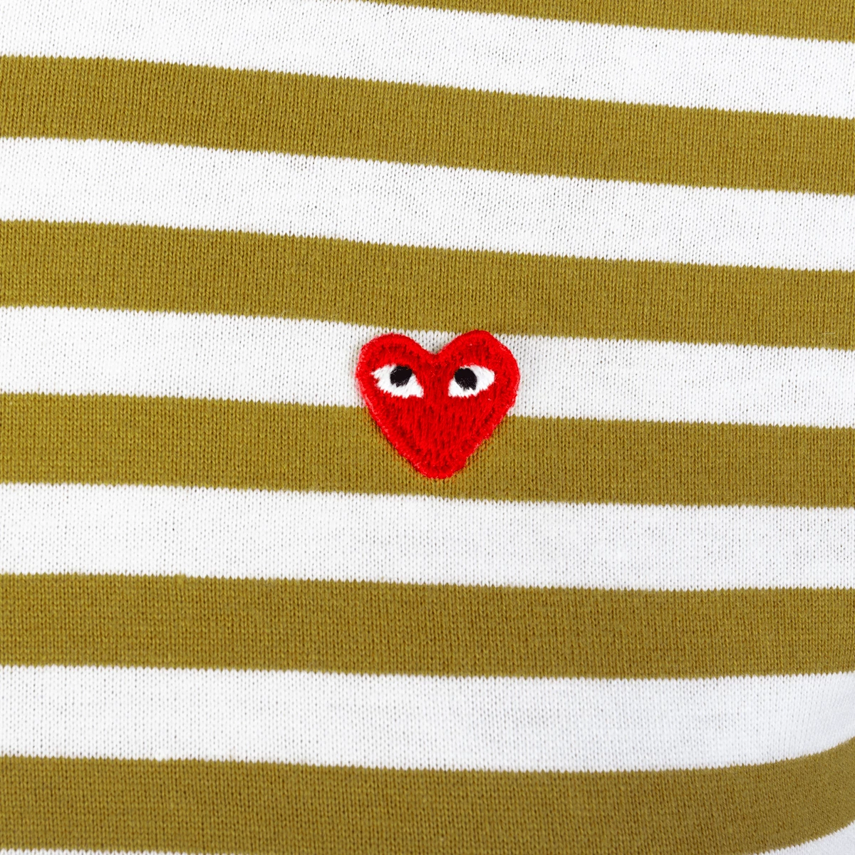 Women’s Red Heart Stripe T-Shirt in Olive from the Comme des Garçons PLAY Classic Collection.