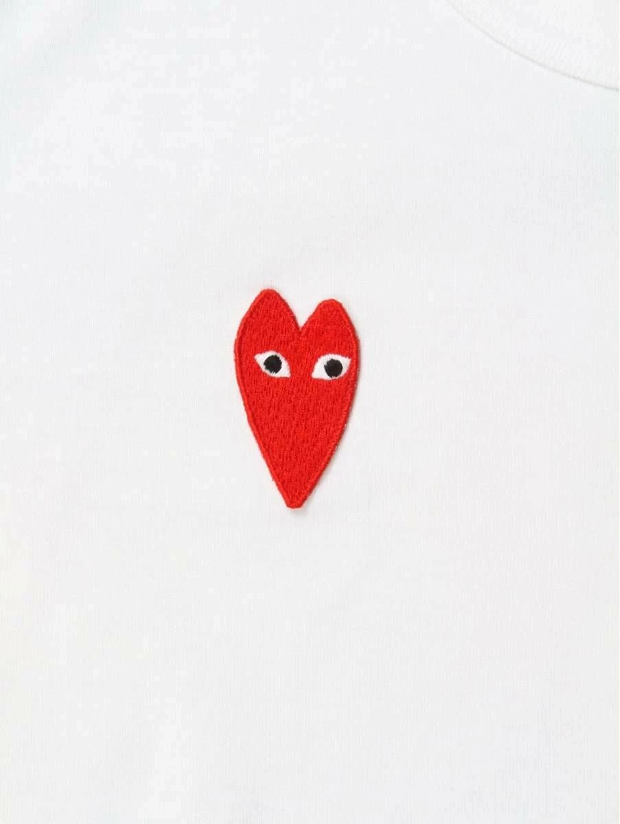Men’s Long Heart T-Shirt in White from the Comme des Garçons PLAY Classic Collection. Comme des Garçons, or “like the boys” in French, has pushed the blurred aesthetic of masculine and feminine motifs with playful overtones since it’s creation in 1969 by legendary designer Rei Kawakubo.