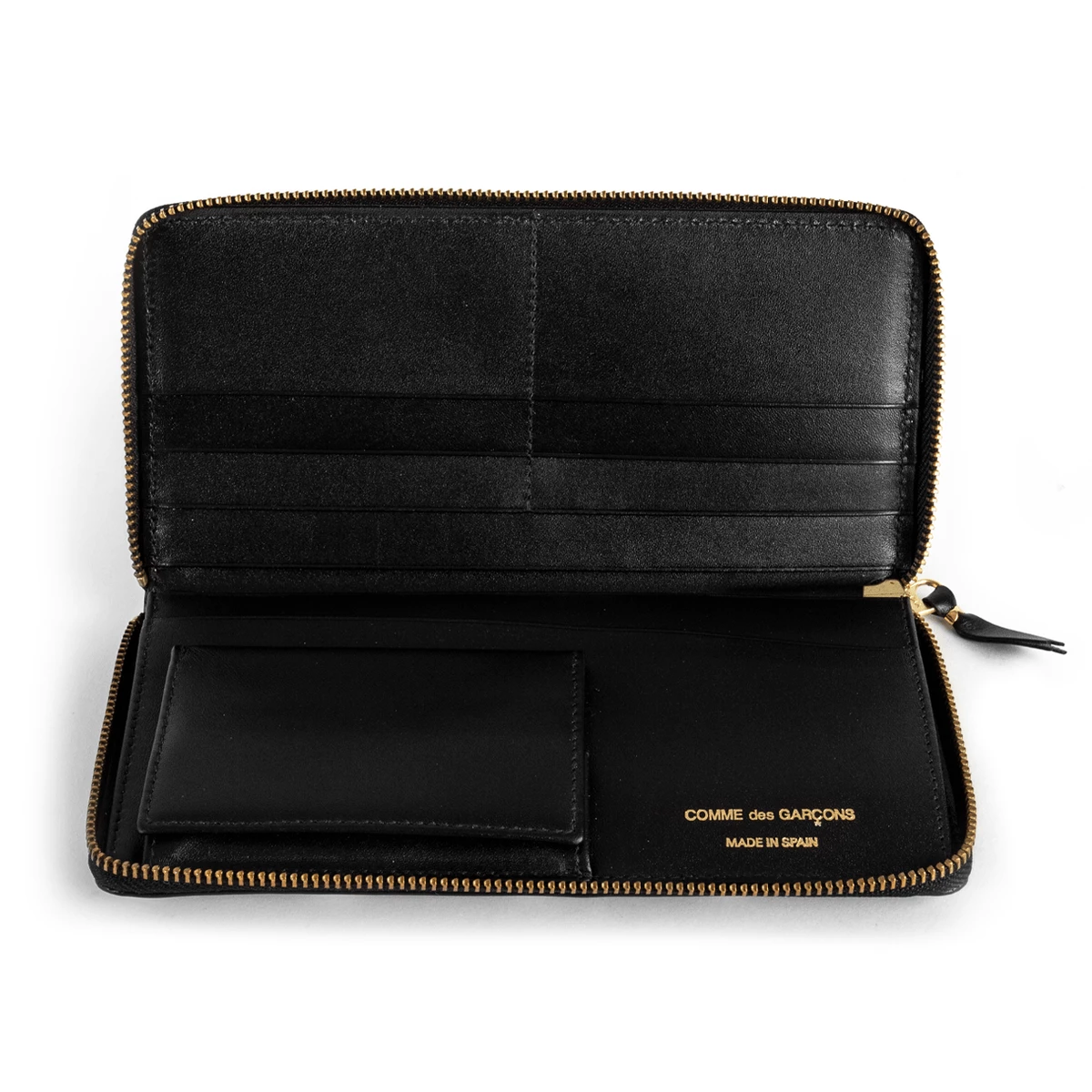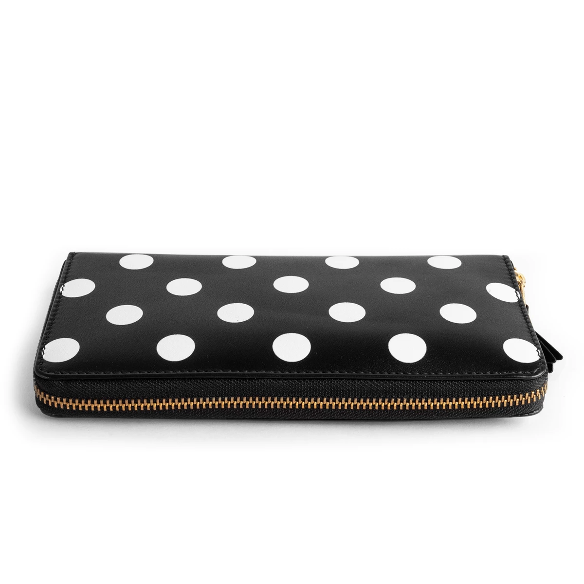 This versatile Purse from Comme des Garçons WALLET comes in black leather with polka dot print in white. Inside there is space for 6 Cards, a compartment for notes and a pouch for coins. The Comme des Garçons logo is written in gold on leather interior.