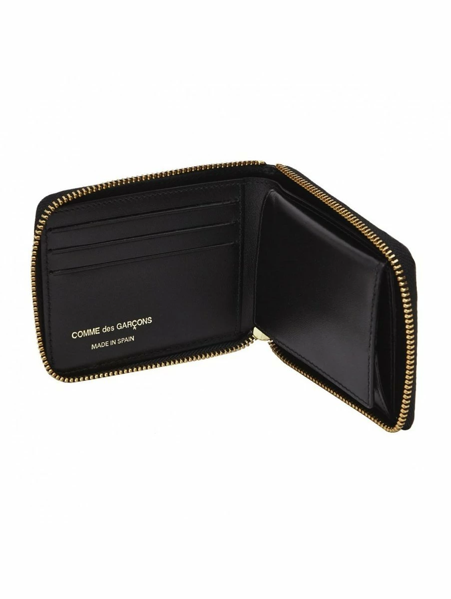 Made from 100% cow hide, this luxury wallet opens with a statement gold zip fasten to reveal space for three credit cards as well as a fold out press stud fasten coin compartment and a separate section for notes. The wallet also comes in a Comme des Garçons presentation box making it ideal as a gift.