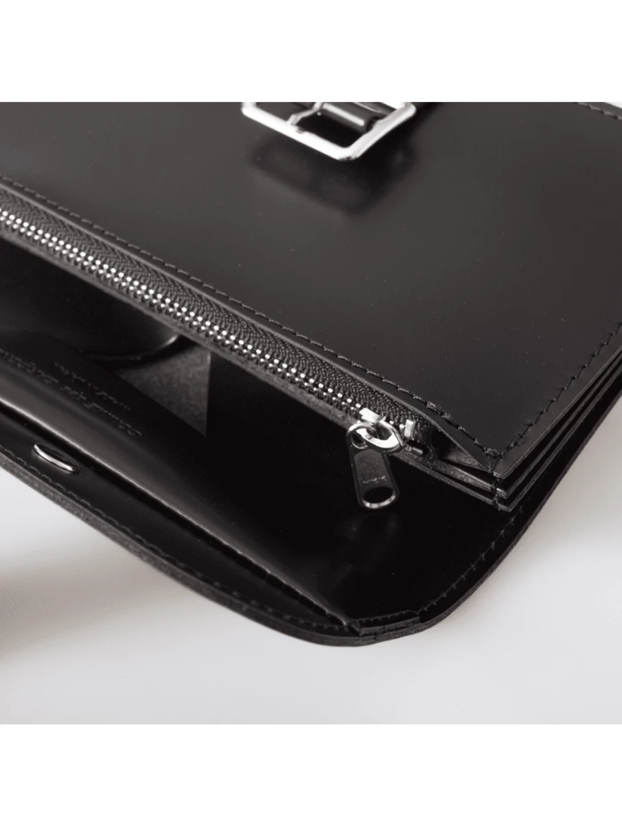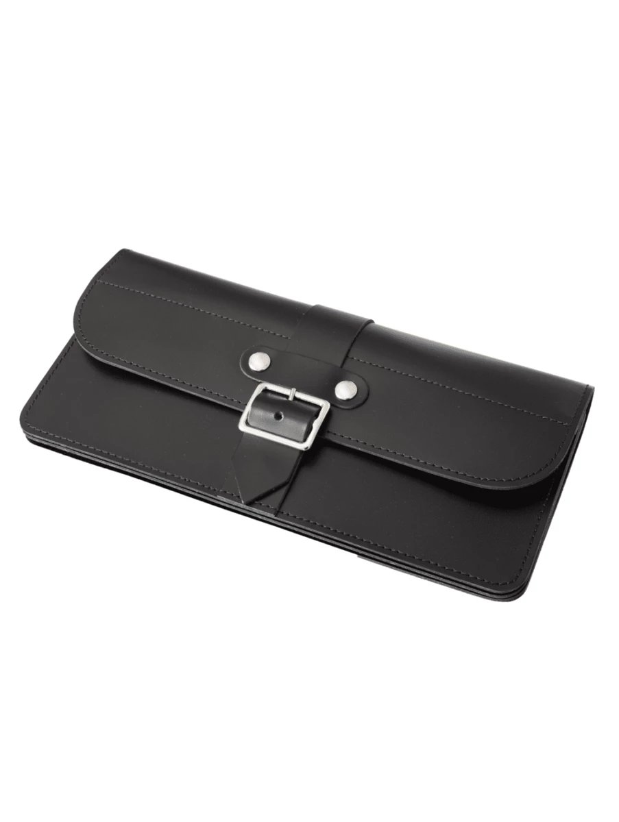 A beautifully hand crafted leather wallet from Comme des Garçons. Fastening on the outer with a statement silver buckle this large wallet features a zipped pocket on the inner aswell as a large fold out compartment perfect for the storage of coins. Small silver studs feature throughout adding a subtle element of detailing. The wallet also comes in a Comme des Garçons presentation box making it ideal as a gift.
