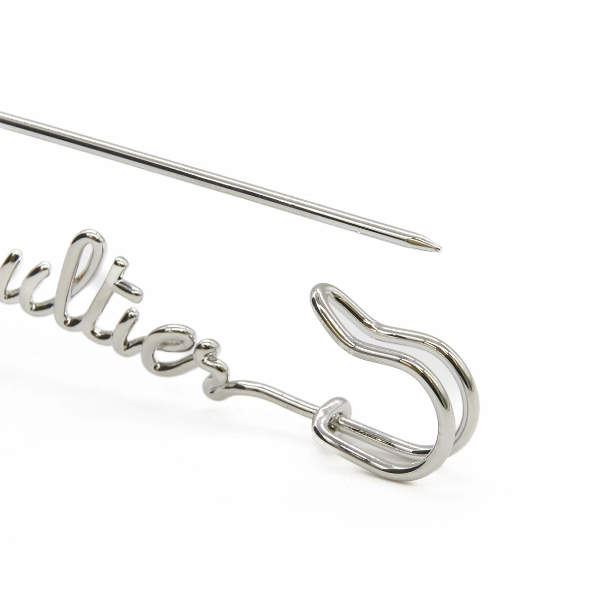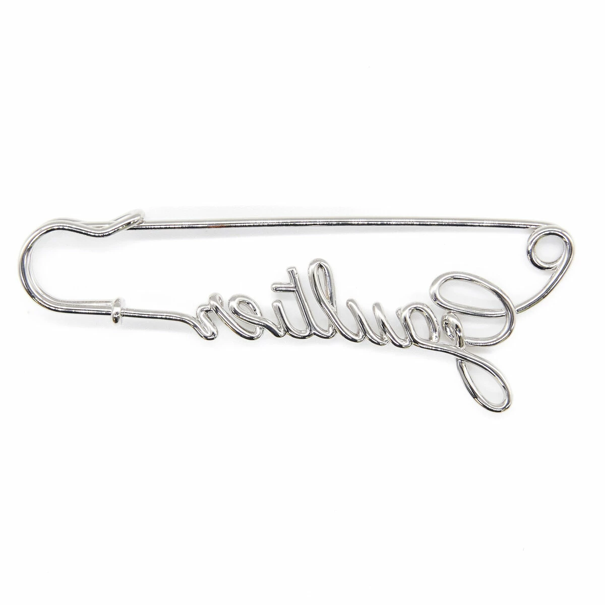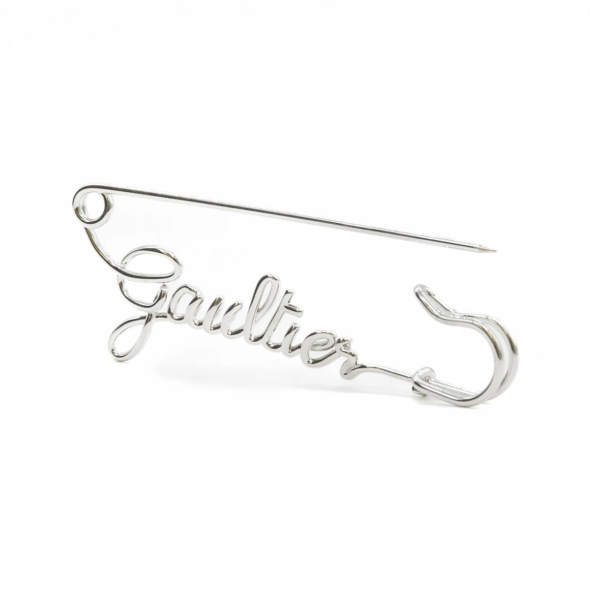 This safety pin-shaped brooch in silver-tone brass features the Gaultier lettering.