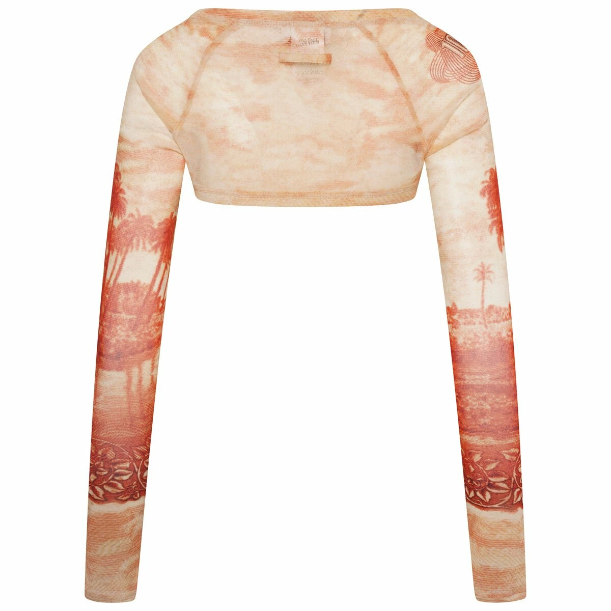 ‘The Palm Tree Bolero’. This season Jean Paul Gaultier honours a number of iconic archive pieces and prints. The Palm Tree Bolero from Jean Paul Gauliter in Ecru red, is a long-sleeved palm tree print tulle bolero.