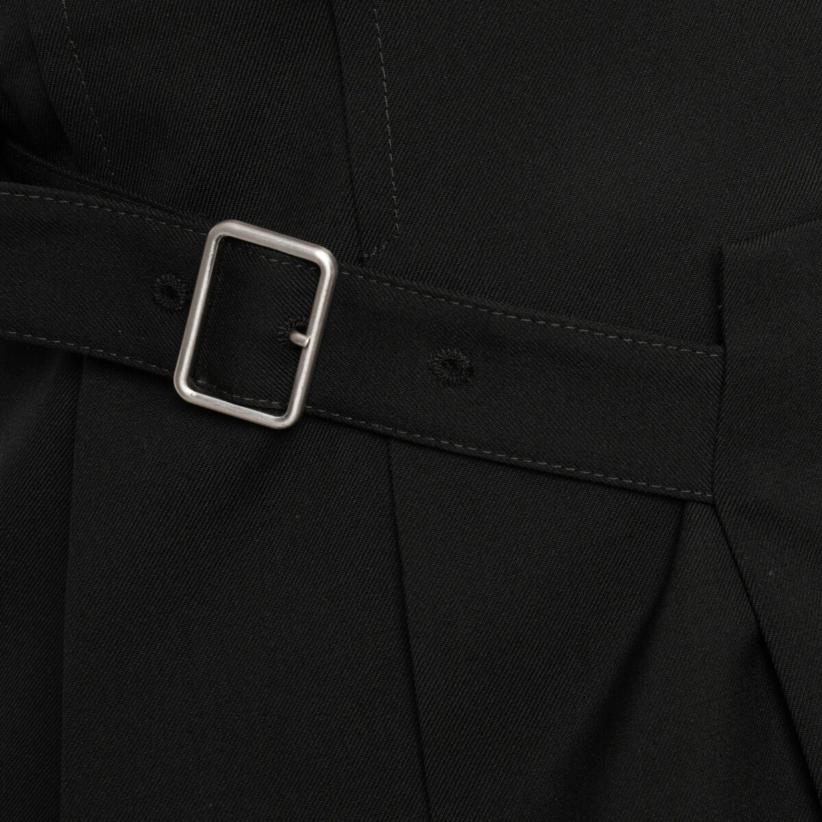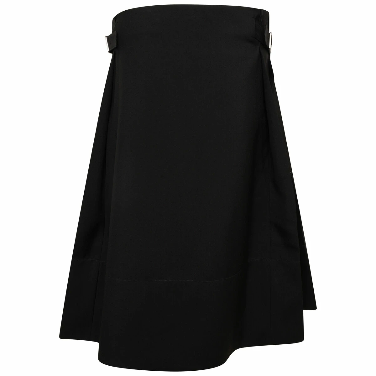 This A-line Fine Wool Gabardine Skirt features a wrap-around style with a front flap, a below-knee length, side pleats, and two adjustable straps on each side.