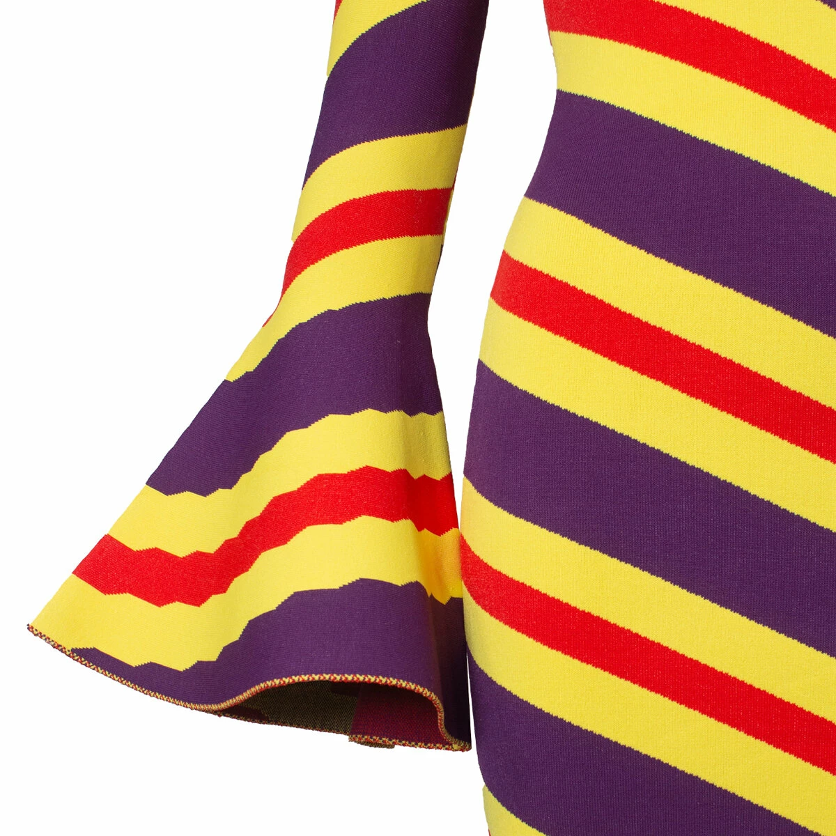 Crafted from soft ribbed knit, this dress features long sleeves with flared hem, a round neckline and diagonal stripe pattern.