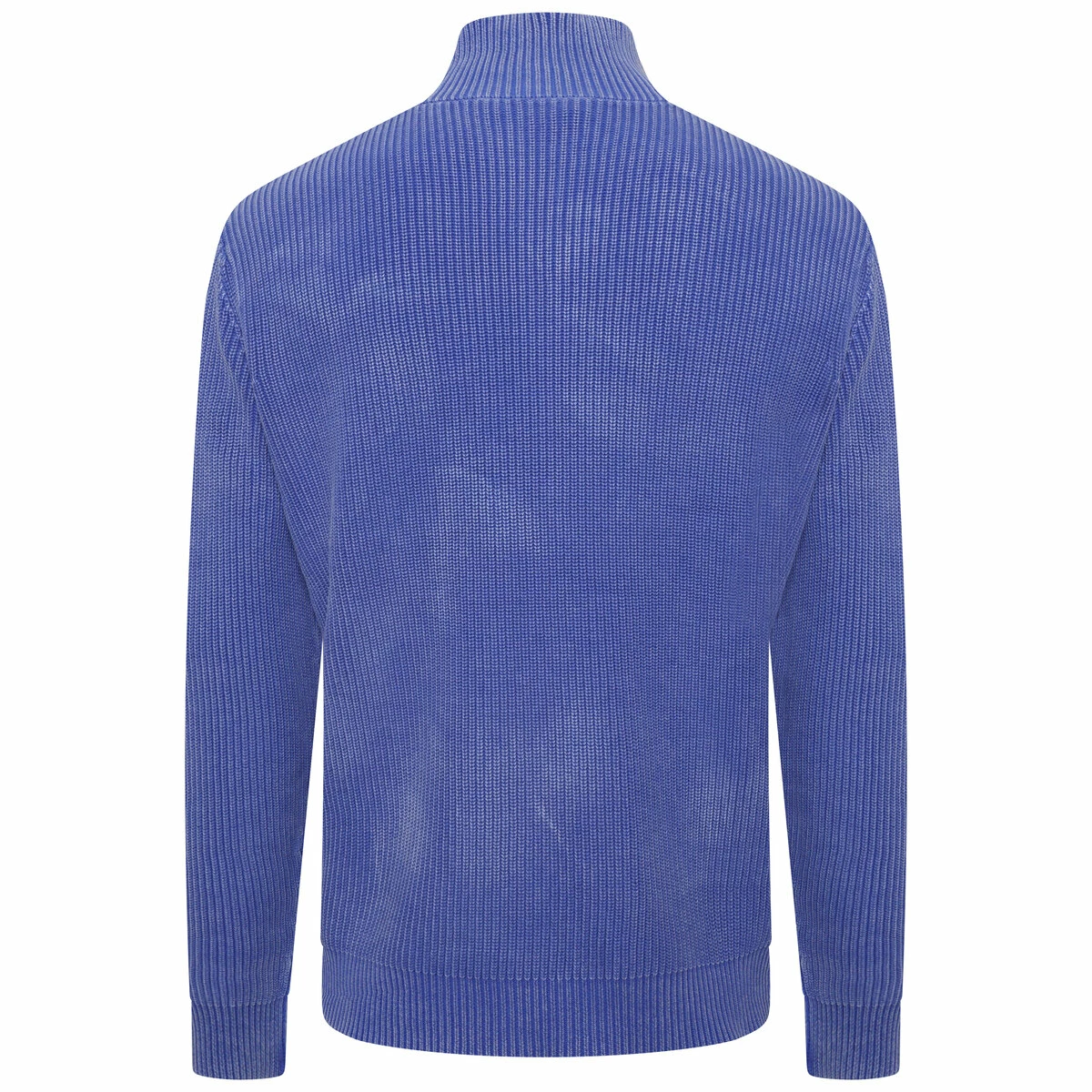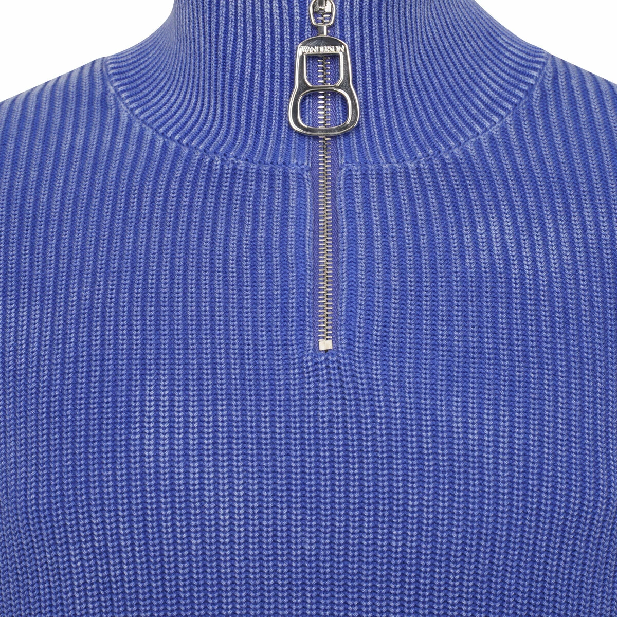 This ribbed knit jumper features a half zip opening with a can design puller, a high neck, long sleeves, and a regular fit for men and a relaxed fit for women.