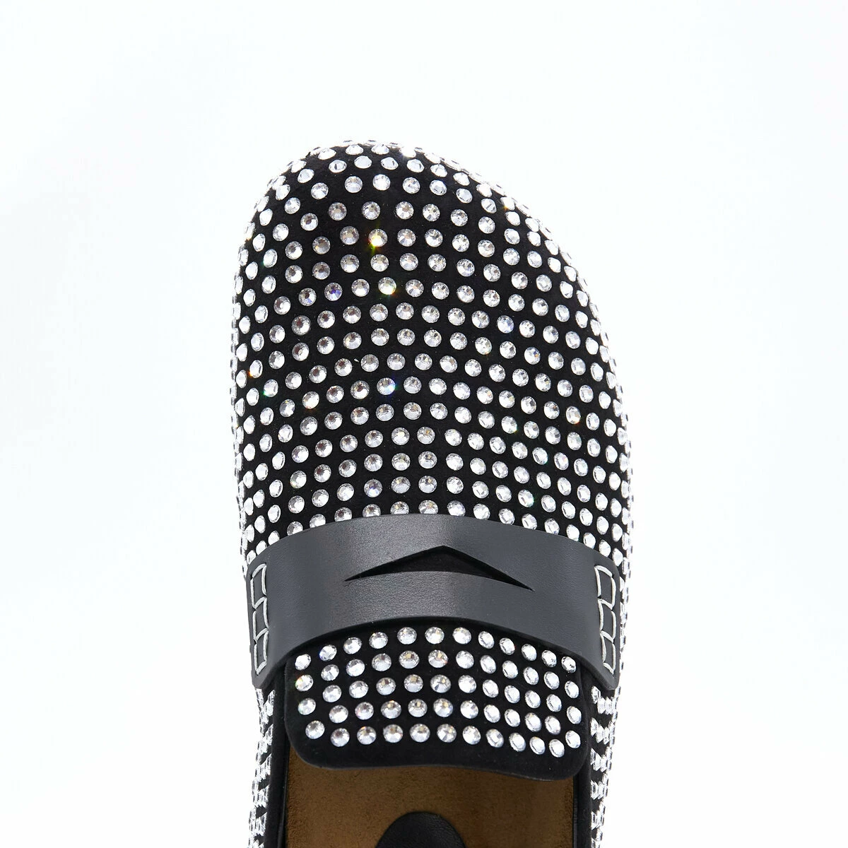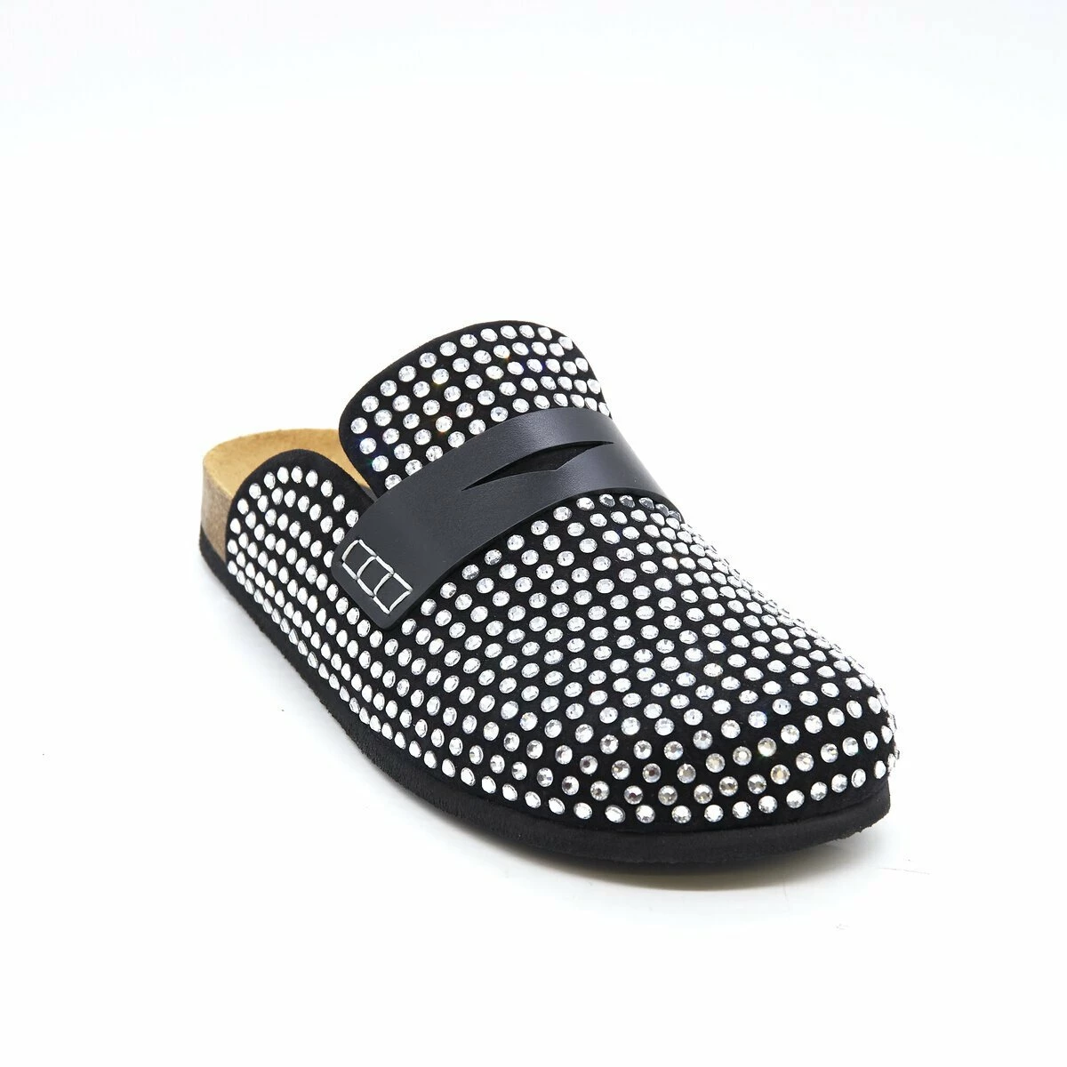 A classic penny loafer style with a modern twist, these backless shoes feature a leather upper, all-over crystal embellishment, a cork midsole and rubber outsole.