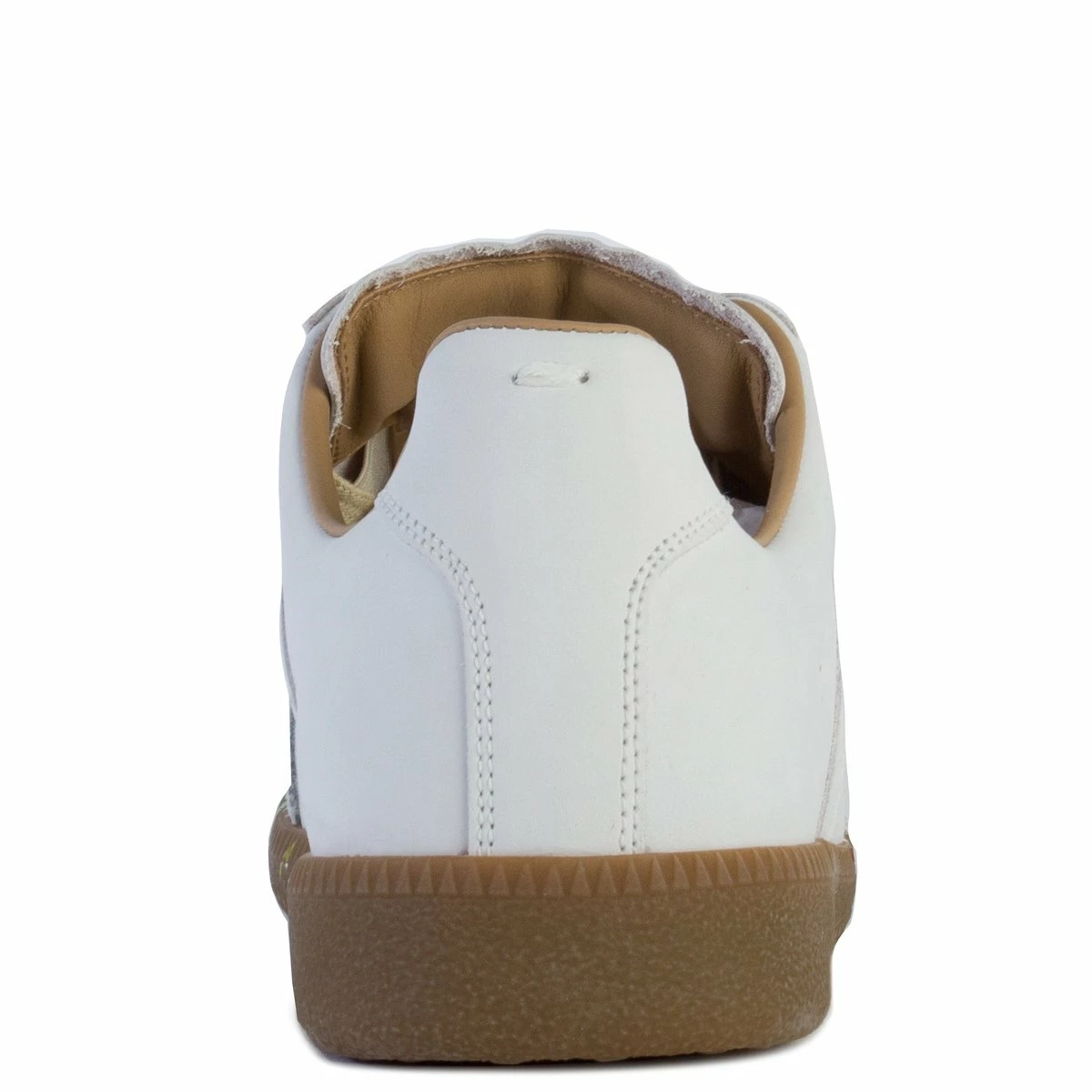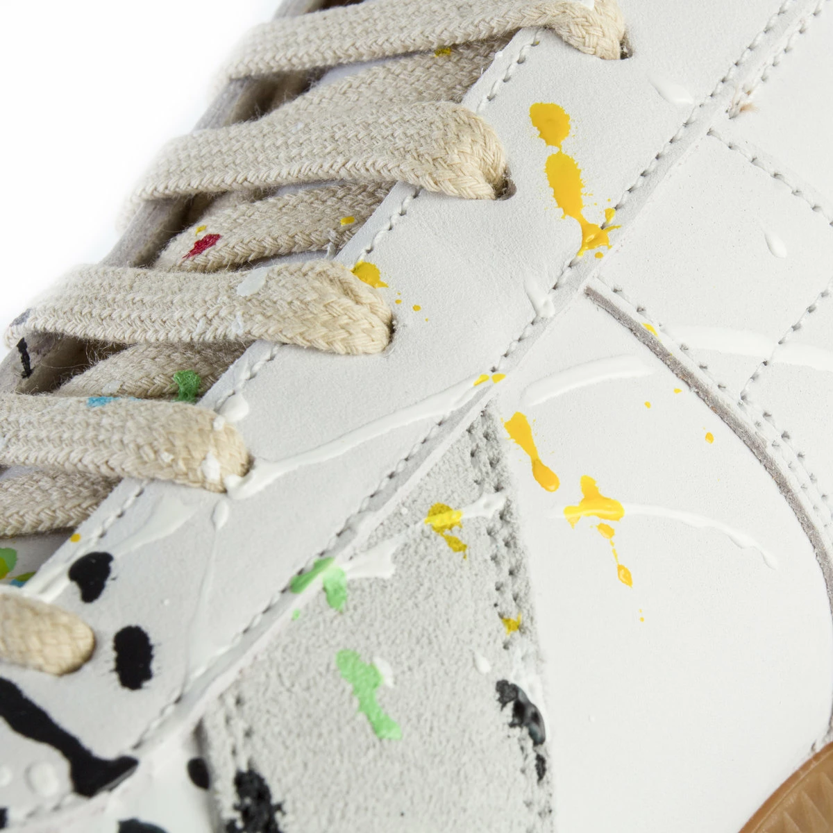 The Replica, now a staple silhouette from Maison Margiela, inspired by German Army trainers is available here with a lambskin and calf split upper, lace-up design, gum sole, and paint splatter detail.