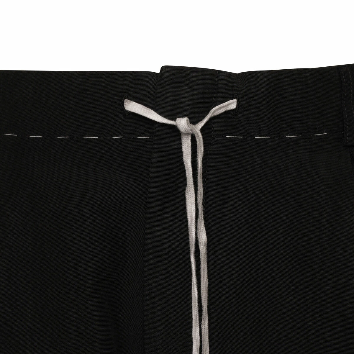 These smart/casual trousers in cotton moiré feature a drawstring waist with belt loops and side buttons for an adjustable fit, a concealed zip fly, wide leg, two side pockets, one back welt pocket, front pleats, and the signature work-in-progress stitching around the waist. Another Maison Margiela’s signature, the four stitches, appear at the back; opposite of a label.