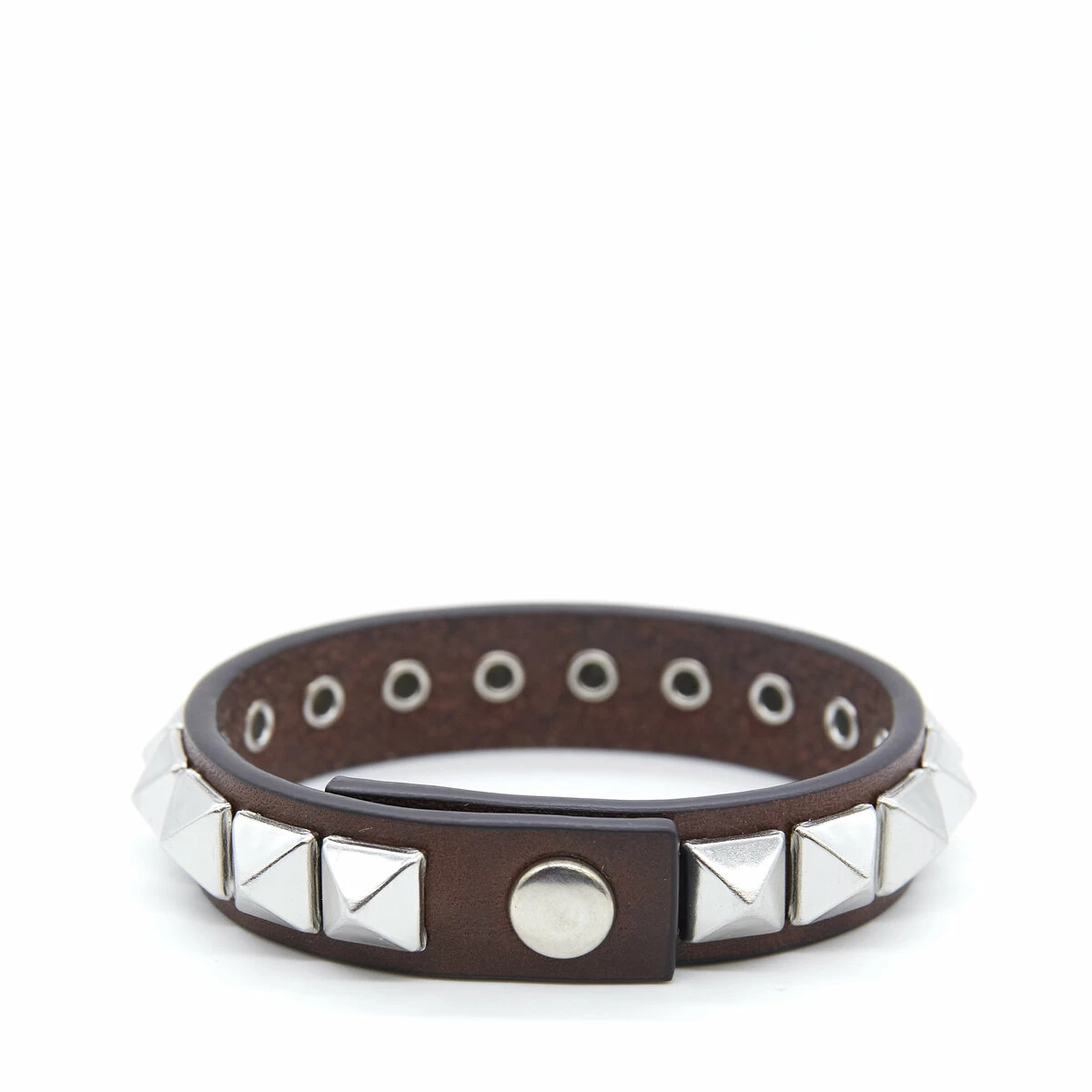 This bracelet, crafted from leather, features a silver-tone pyramid design in a semi-polished finish, and an adjustable two-button snap fastening.