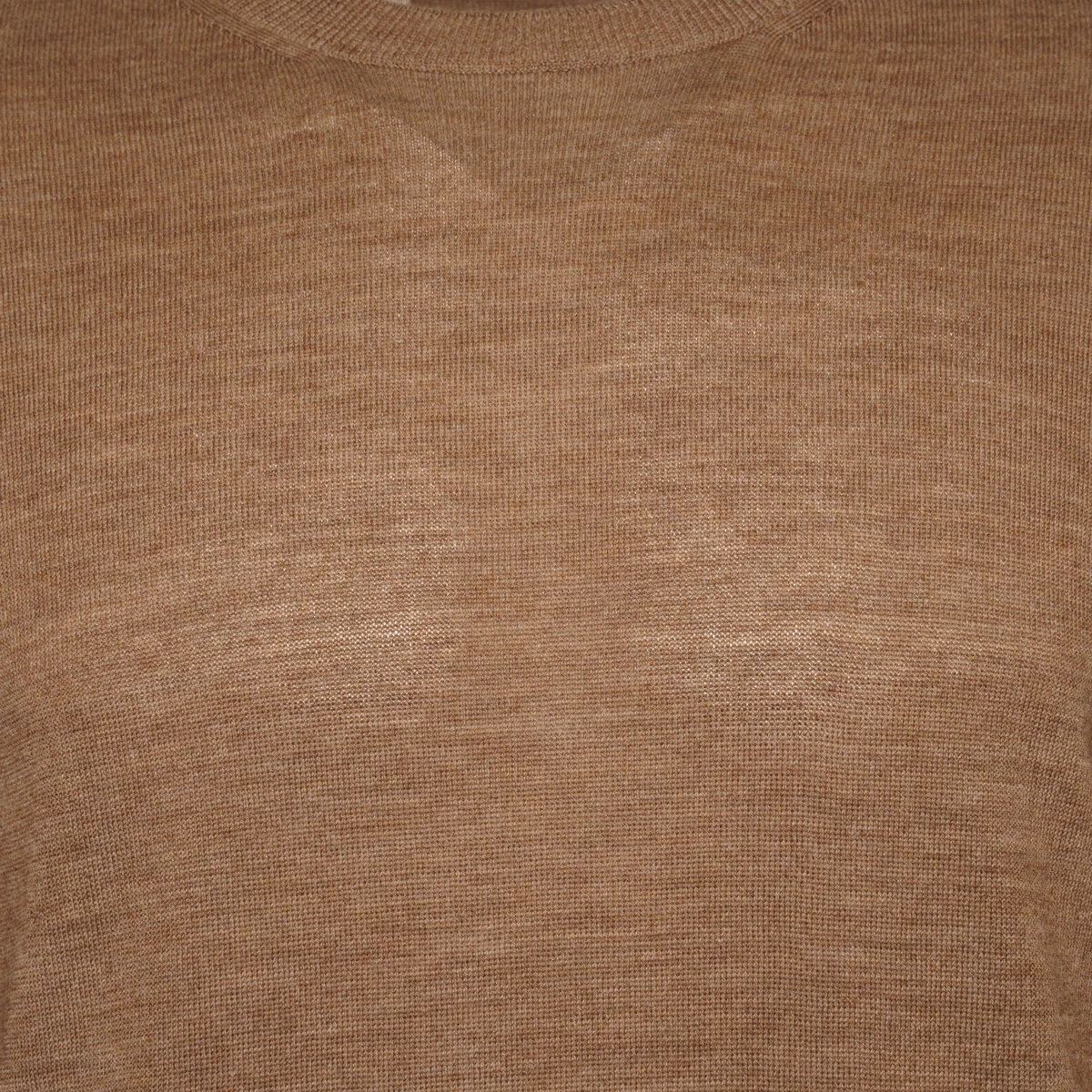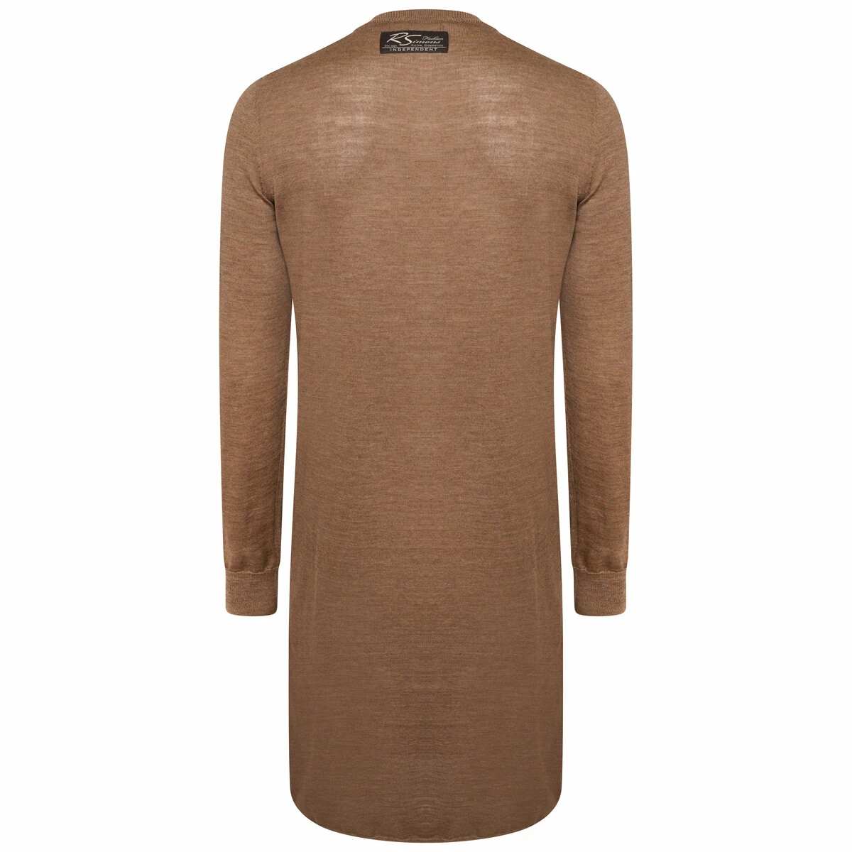 This fine-knit dress features a relaxed fit, long sleeves, a crew neckline, and a knee length.