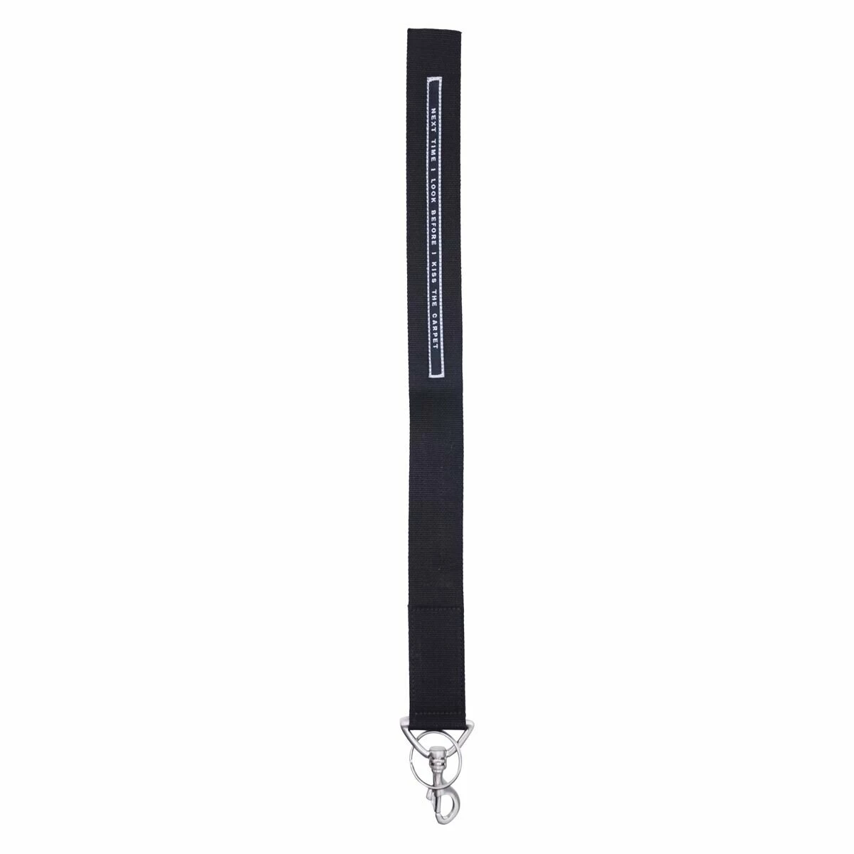Urban design featuring a witty slogan ‘Next time I look before I kiss the carpet’, a webbing strap folded in half, a keyring and a lobster claw clasp making it easy to clip onto your bags or belt hoops.