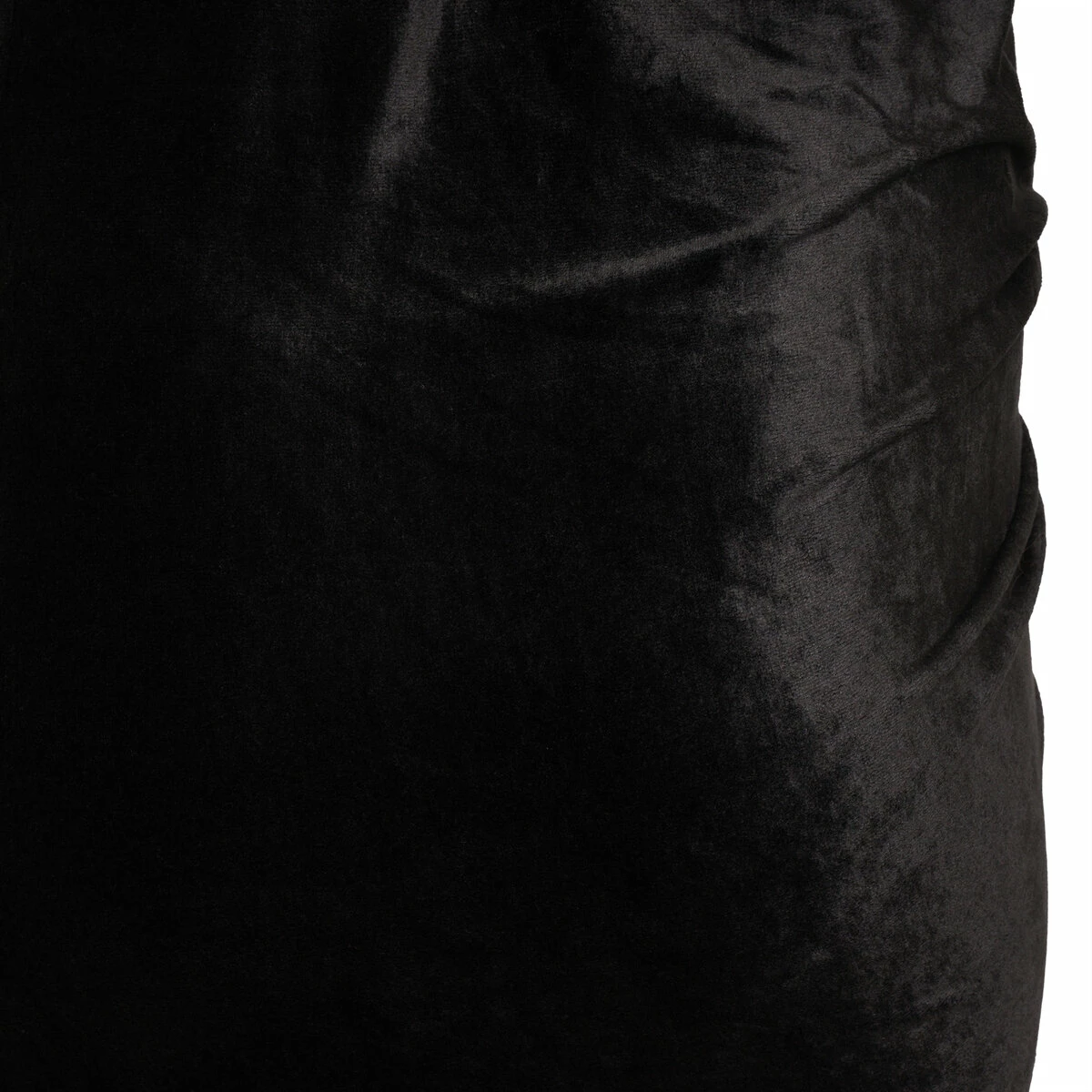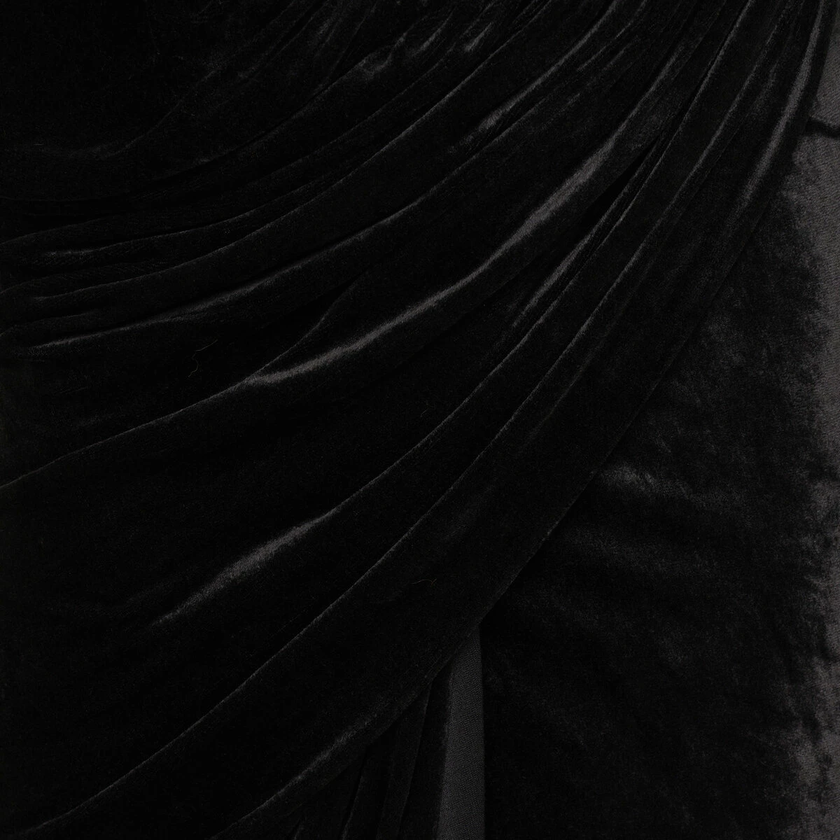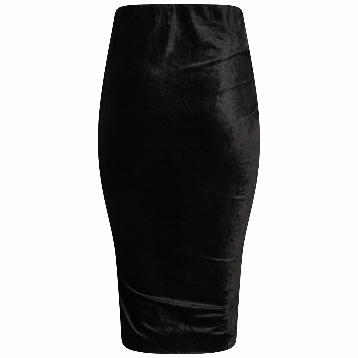 This Vered Skirt, crafted from a drapey velvet jersey, features a knee length and an elasticated waistband. Its main feature is a front wrapped panel that is gathered at the left hip, creating a high sassy slit.