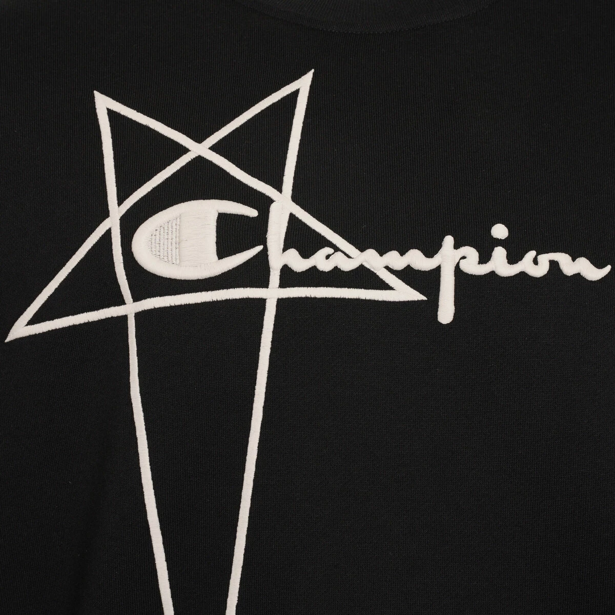 It has a 3D embroidered signature Rick Owens x Champion pentagram logo on the front and the Champion logo on the right sleeve.