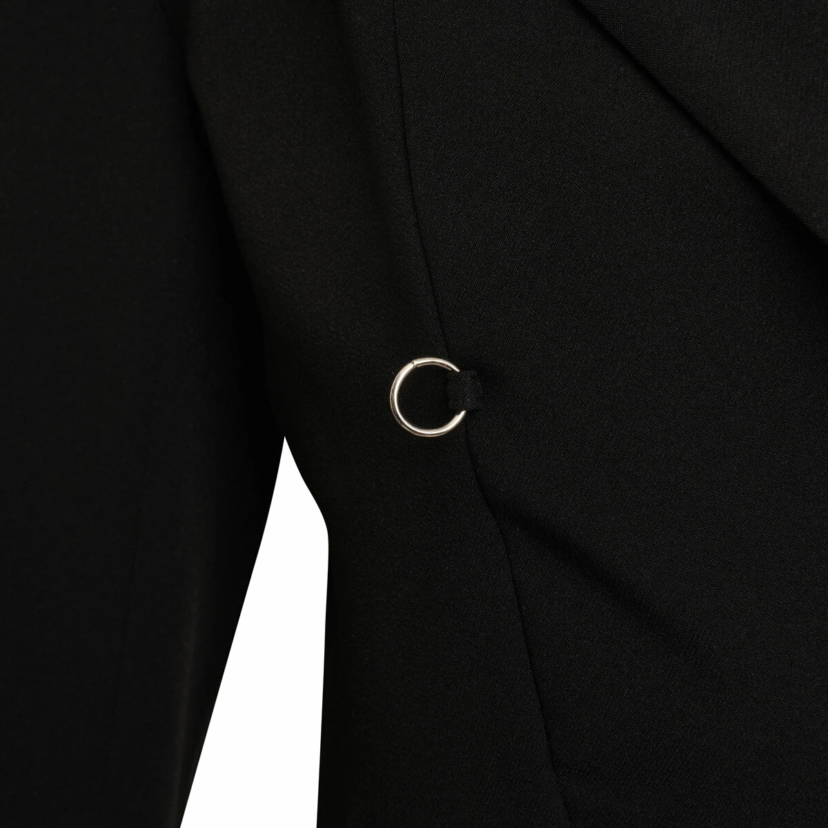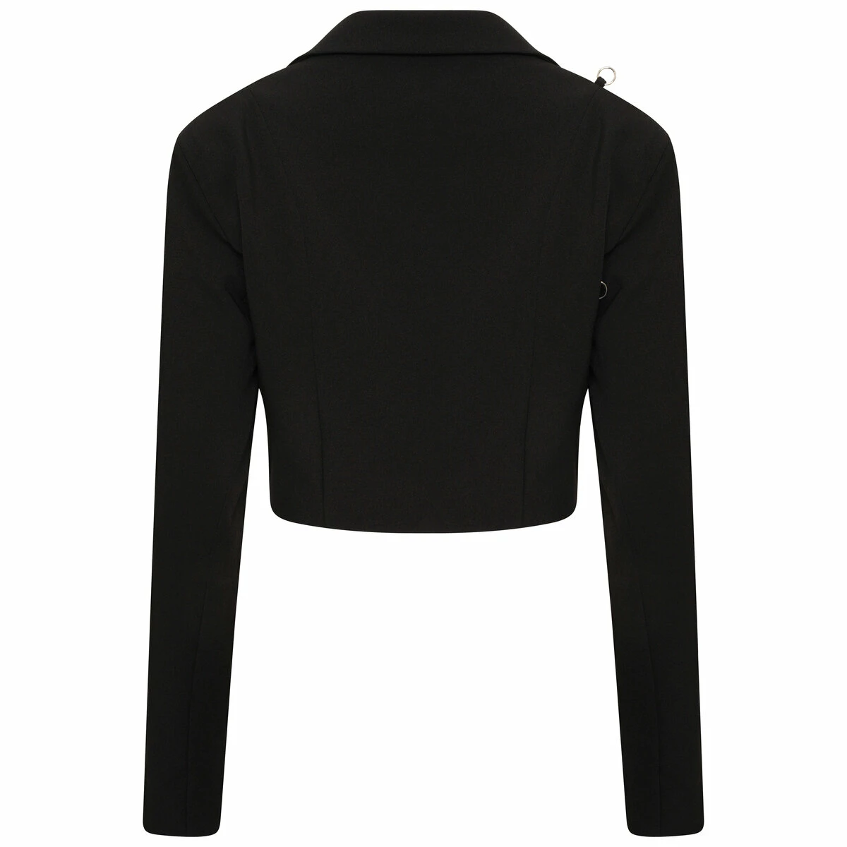 This Woven Cropped Blazer has a notched lapel collar and padded shoulders.