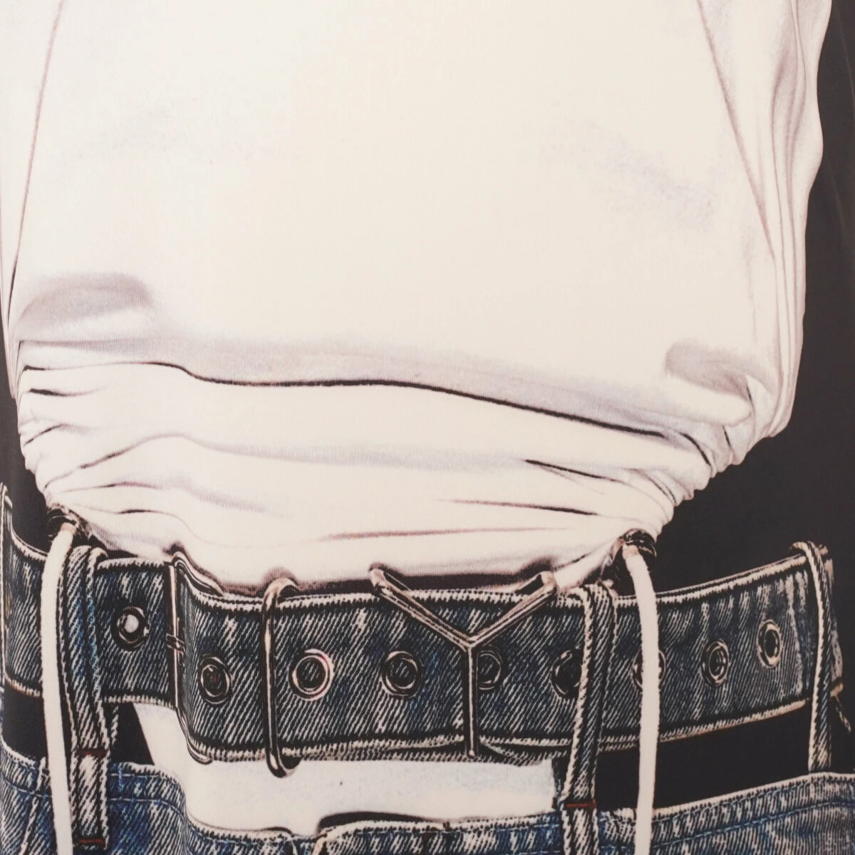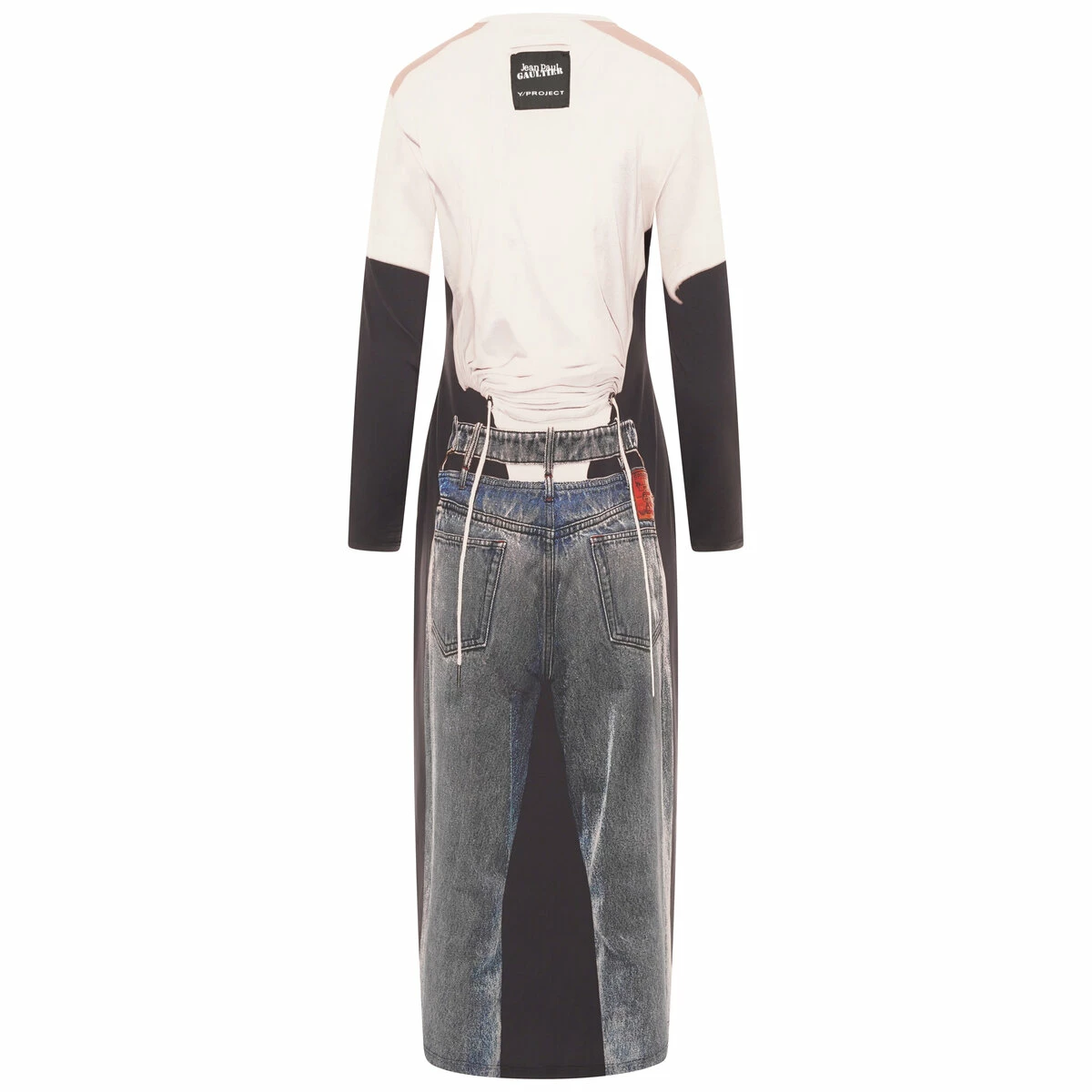 This fitted long sleeve maxi dress, designed in collaboration with Jean-Paul Gaultier, features a trompe l’oeil print of Y/Project’s Ruched T-Shirt Bodysuit and Y Belt Jeans, inspired by Jean-Paul Gaultier’s TROMPE L’ŒIL designs.