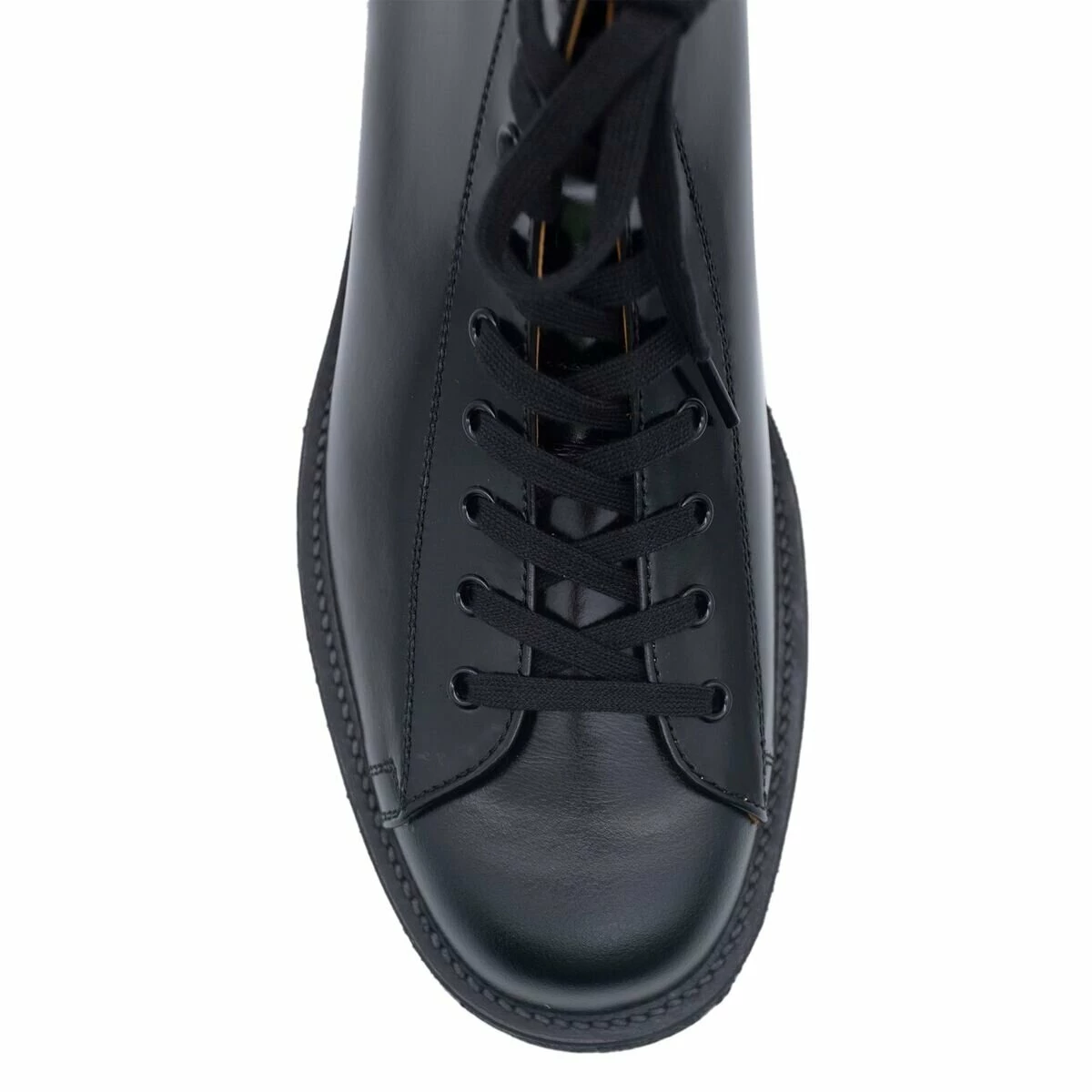 A statement piece from Yohji Yamamoto, the classic Demi Boots are crafted from a polished leather that will soften and wrinkle with wear giving a vintage feel. For this season, these Demi Boots feature High Gloss Leather and Satin Finish on the toe. The lace-up fastening and chunky rubber sole complete the look.