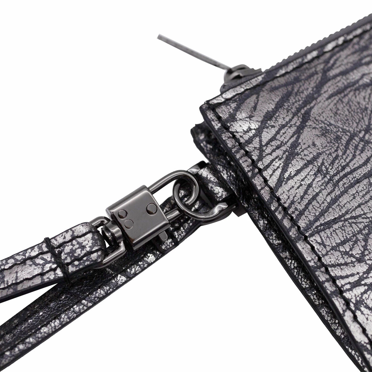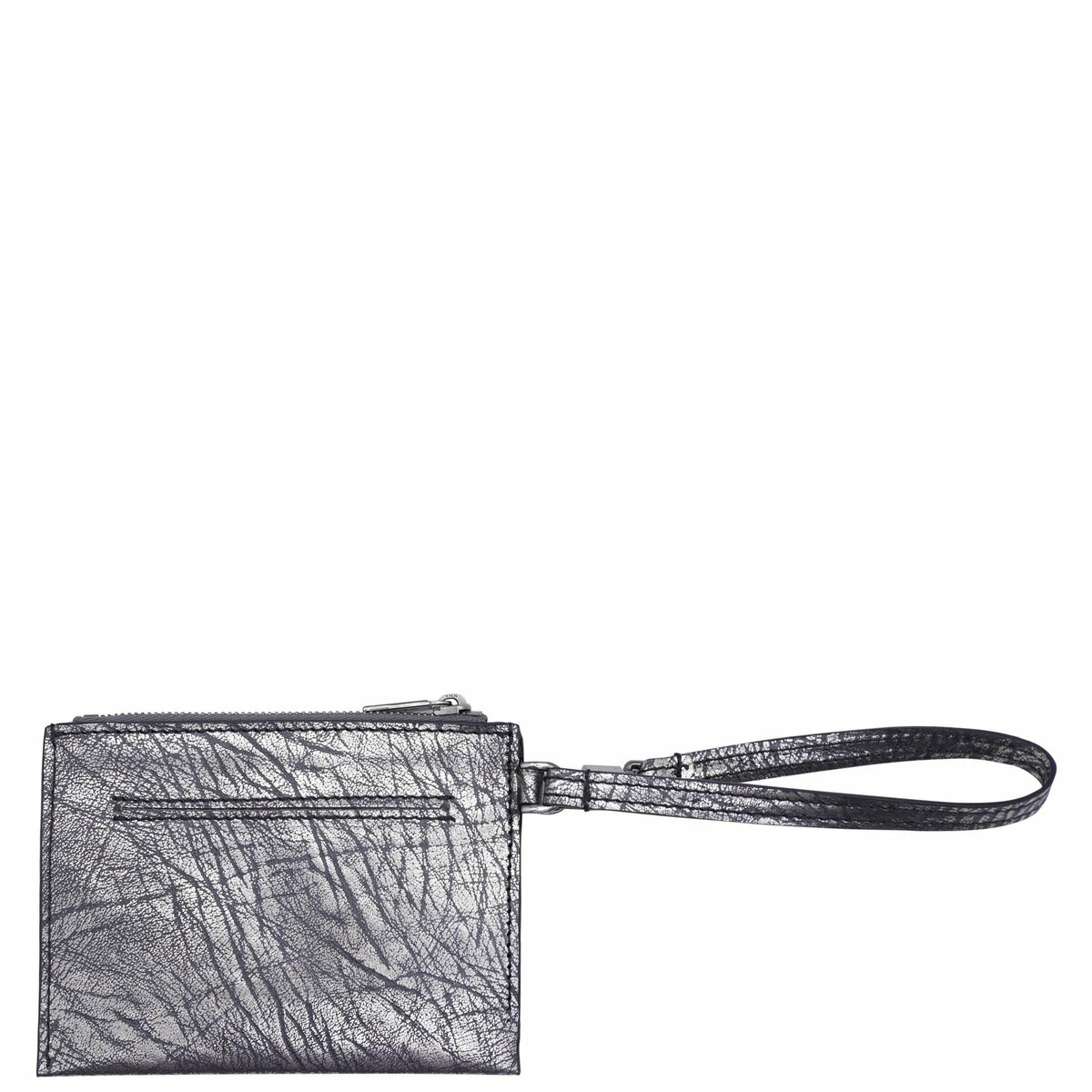 This keyring wallet features a zip closure, two inner compartments with a short chain and a key ring, an outer card slot, a wrist strap and an embossed logo detail.