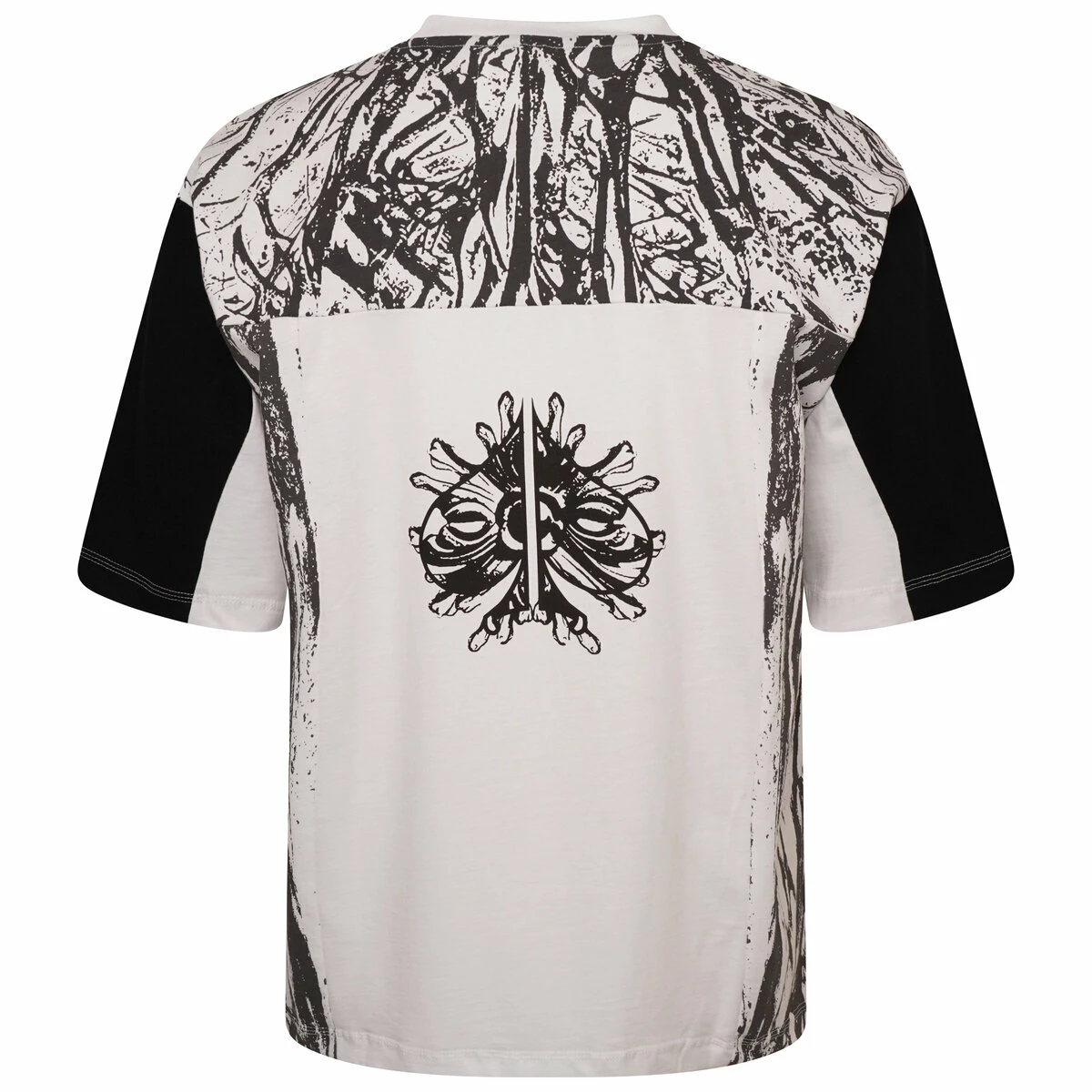 This T-Shirt features a Skeleton Logo Print on the front and spinal column print in the back, highlighted by the shoulder cut-outs with adjustable leather straps.